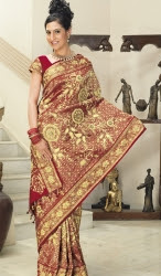 This saree stands out for its creative play with stripes, colours and patterns. The Multi-coloured closely placed vertical stripes; broad stripes with inlaid gold jari patterns, temple borders and the bavanji design head piece, all together create a magnificent and luxurious creation. Bright blue colour silken canvas makes the other designs and patterns to come alive.Setting a new trend, this silken wonder carries lakhs of mango patterns in bright gold colours both on the body and the head piece. The dark mahogany background is an appropriate contrast to the golden mango designs and further enhances the radiance of this creation. The head piece too is beautifully designed and complements the entire look and feel and this saree.